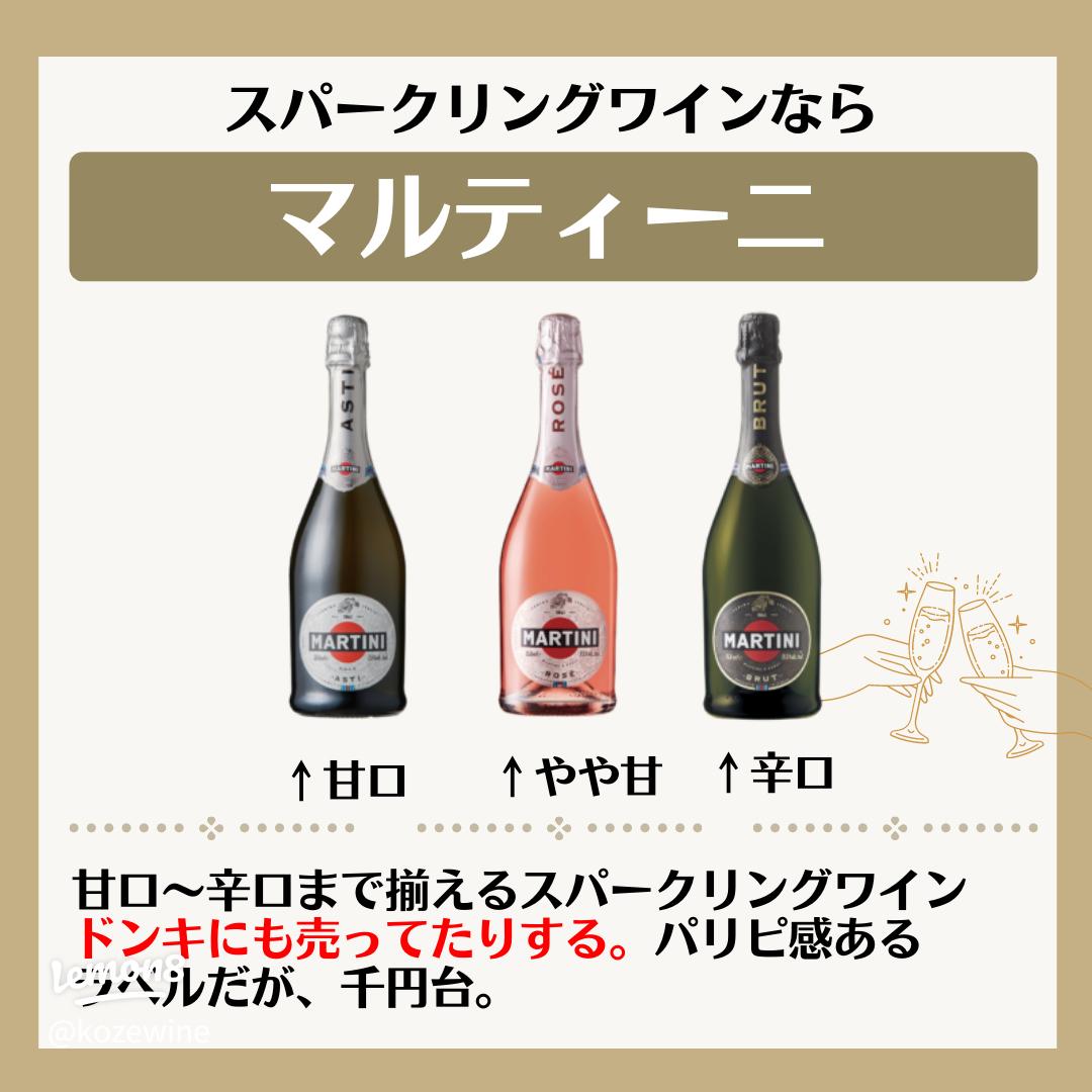 KOZE こぜ @ワインマニア on X: " ドンキで買えるワイン初心者向けの 甘くて飲みやすい スパークリングワイン 「マルティーニアスティ」ざっと千円台前半 マスカットや紅茶みたいな香り。 甘くすっきりしてるから初心者に。 色々種類があるけど 細いとこに「ASTI。