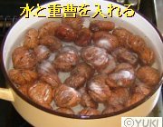 鍋に栗とたっぷりの水、重曹入れて火にかける。
