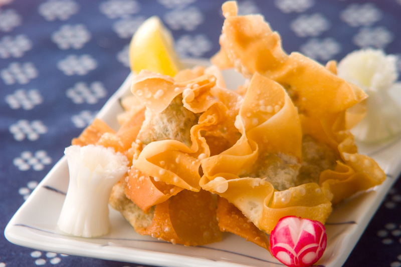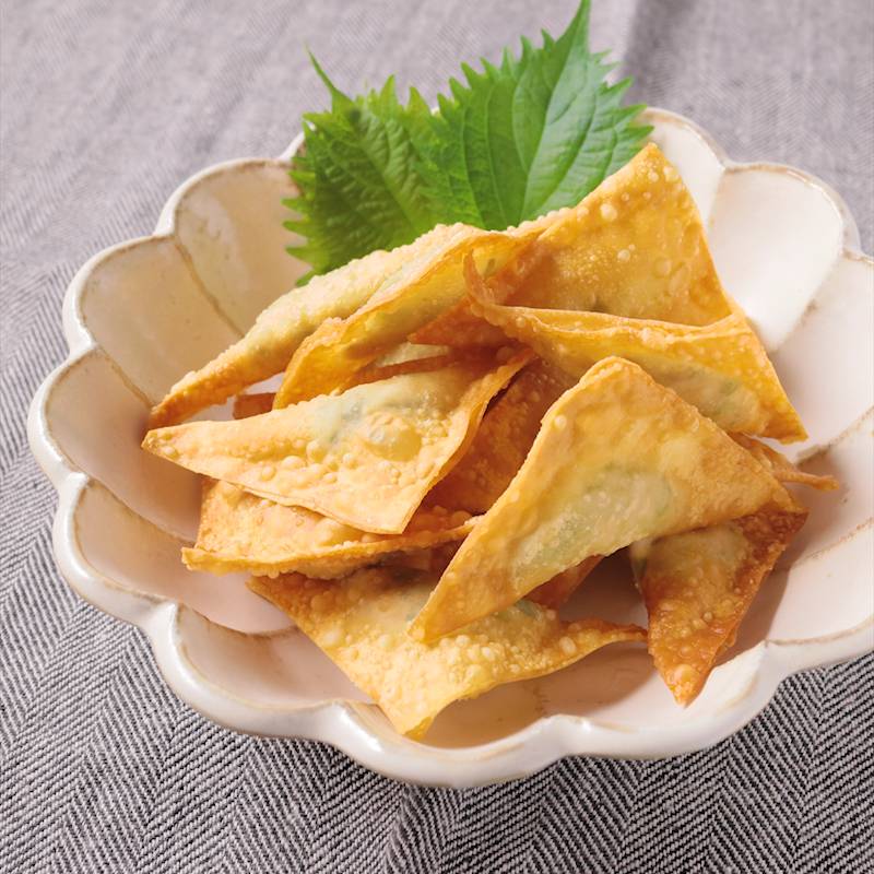 揚げエビワンタン はワンタン皮で揚げてこそ究極のサクサクに!エビの風味とクリスピー食感がたまらない。