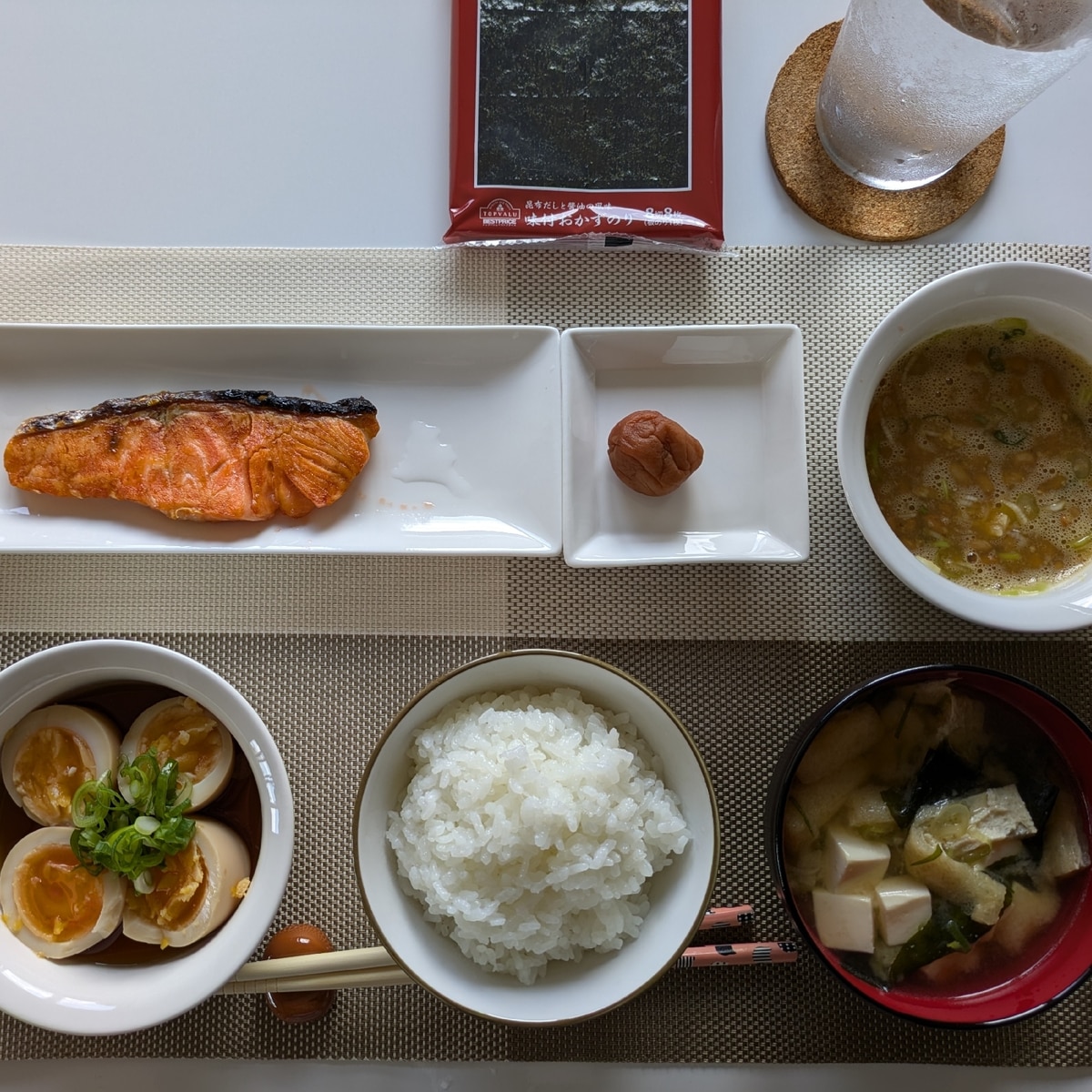 10 19。 朝ごはん。 ○梅干し、ごはん ○レタススープ ○鮭の西京焼き、ゆで卵 ○オクラ胡麻和え ○大学芋 ○きゅうりもずく酢○シャインマスカット 朝ごはん朝食breakfast和食献立japanesefood料理手料理家庭料理食育ヘルシー減。