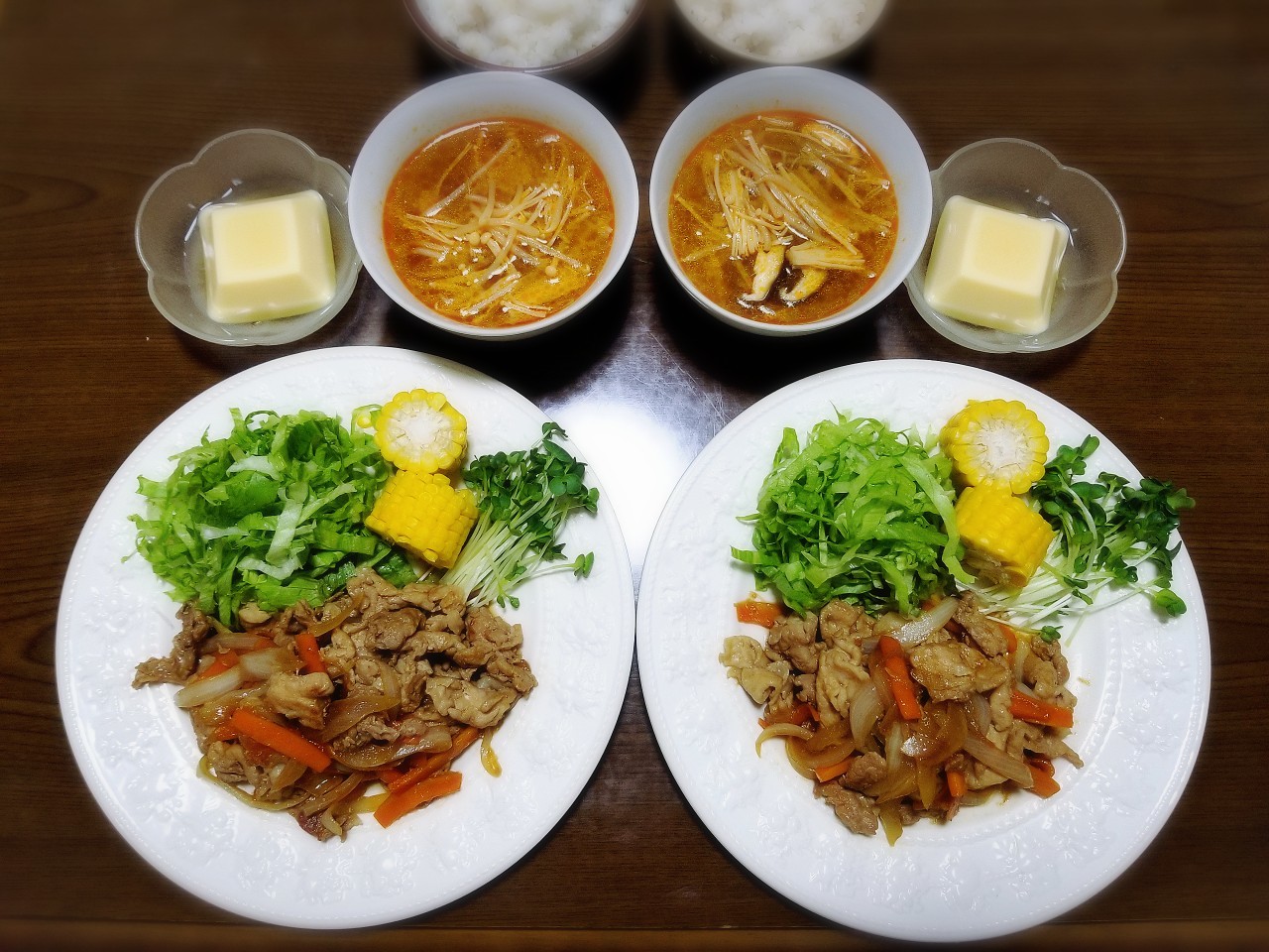 献立 №242 豚肉の生姜焼き・酸辣湯豆腐スープほか俺でもできる簡単クッキング。