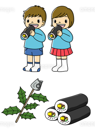 恵方巻を食べる子供とイワシの頭を刺したヒイラギのイラスト素材FYI02836104ストックフォトの QleanMarket キュリンマーケット。