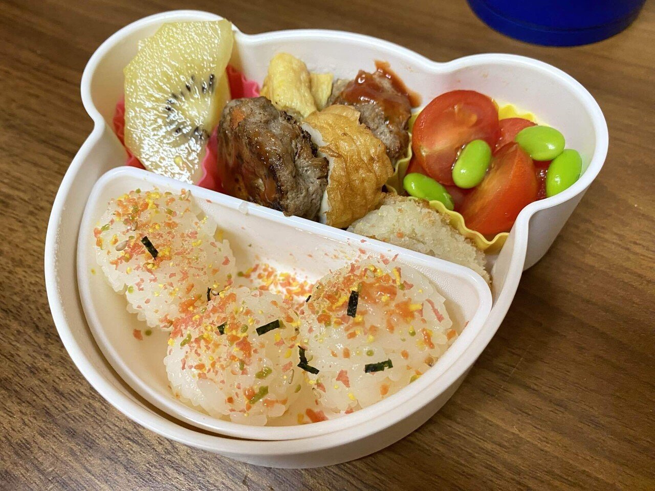 幼稚園のお弁当デー。 昨夜の夕食をハンバーグにして、弁当用に小さめのものを2つ作って今朝焼いた。玉子巻き、チーズちくわ、1 4に切ったコロッケなど色々入れて完成🎉彩りに冷凍のむき枝豆を入れたら華やかなEmi.V。