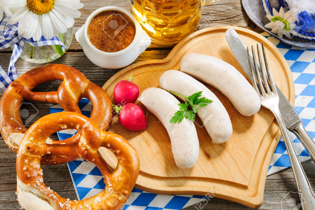 伝統的なバイエルン料理。甘いマスタードとプレッツェルの白いソーセージの写真素材・画像素材 Image 64820027。