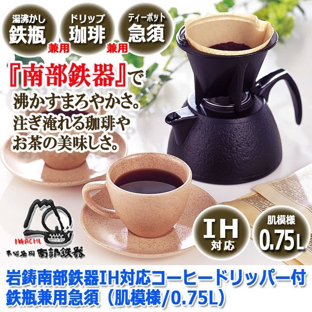岩鋳南部鉄器IH対応コーヒードリッパー付鉄瓶兼用急須 肌模様 0.75L INN-139。