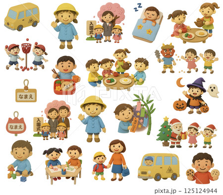 Vector de Stock 運動会、家族でお弁当を食べるイラスト、白の体操着を着た子どもの競技などの手描きイラスト素材セットAdobeStock。