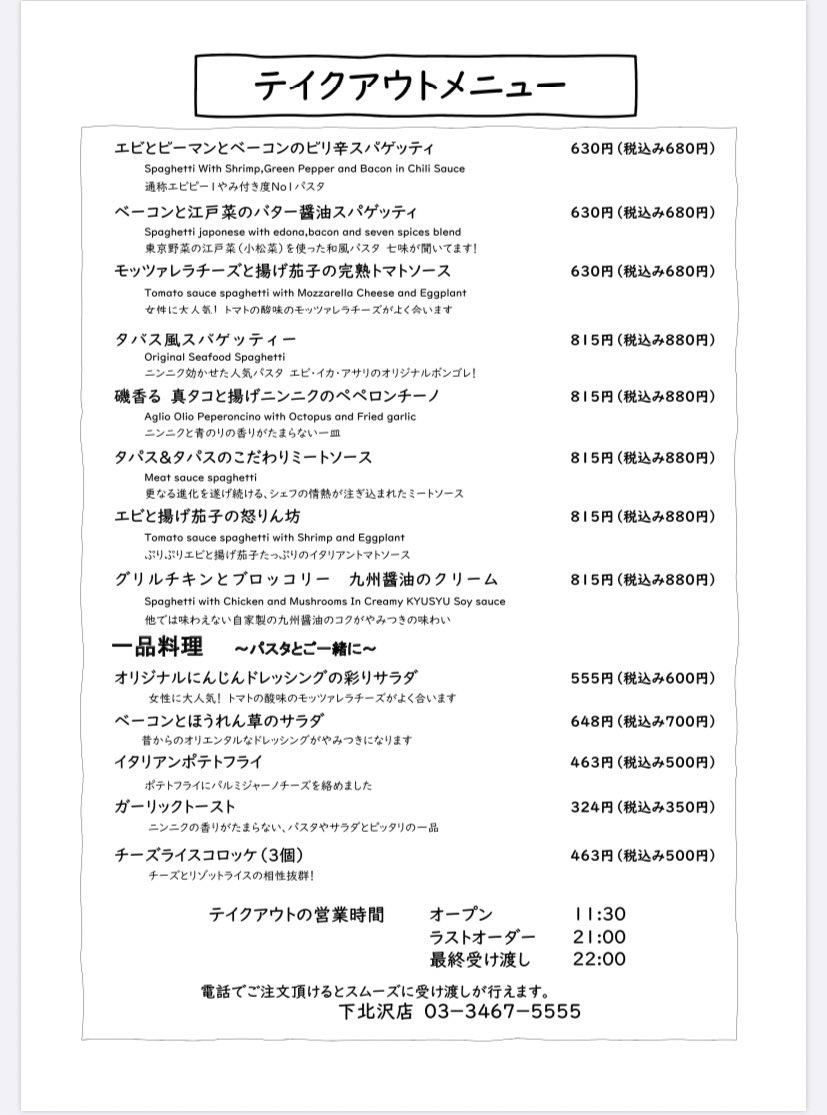 タパス&タパス吉祥寺駅前店でテイクアウト開始!お手頃価格でパスタが買えるキチナビ。