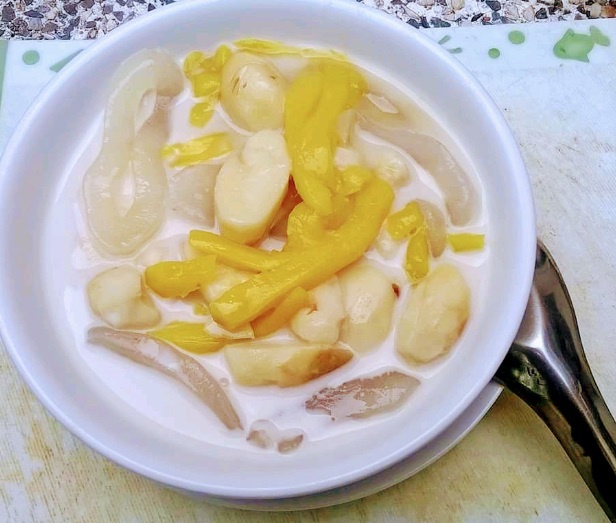 アカシア蜂蜜とシロップ漬けでつくるそら豆団子のフルーツポンチ。