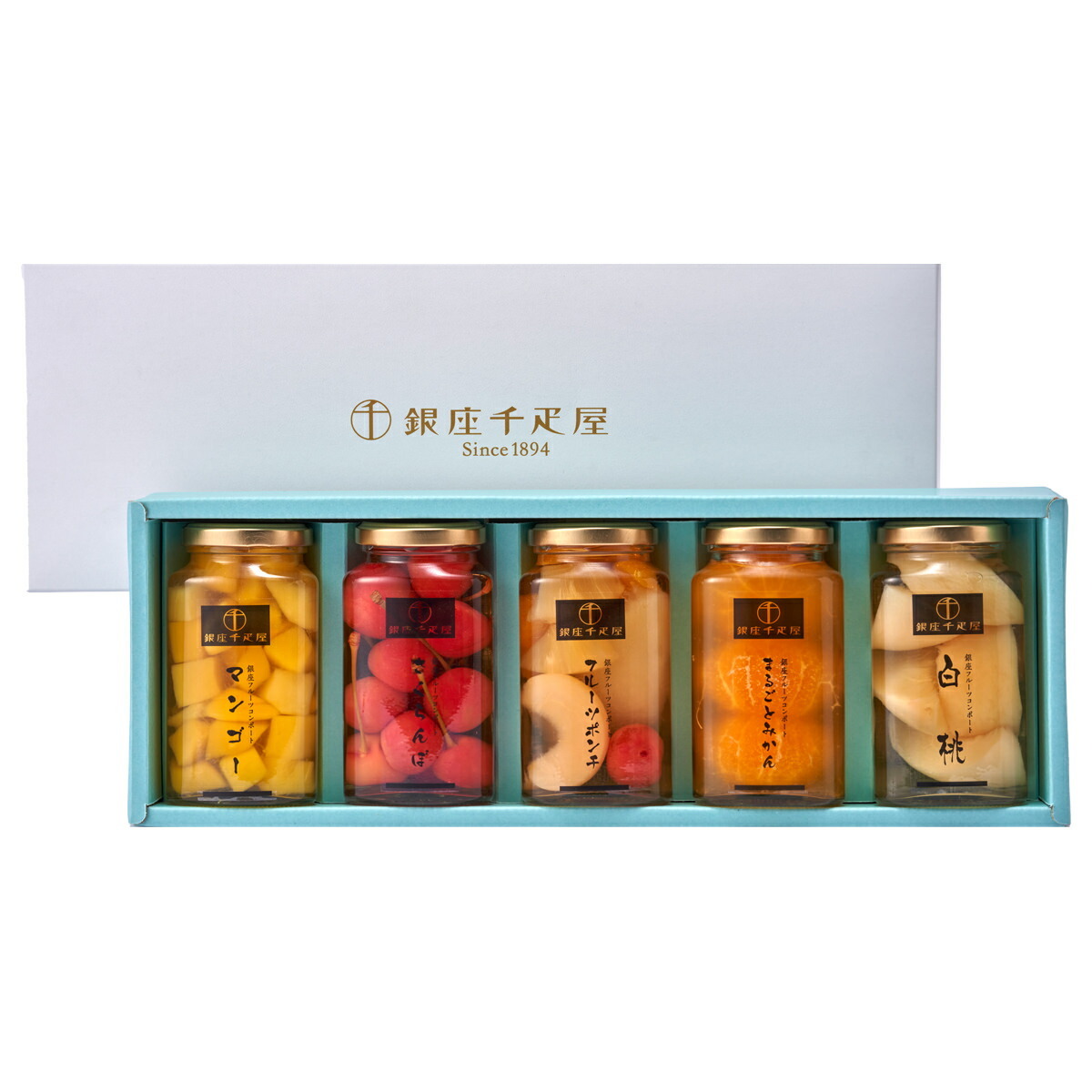 銀座千疋屋 果実のシロップ漬け 5種類 みかん・さくらんぼ・マンゴー・白桃・フルーツポンチ 洋菓子 贈り物 秋の味覚ギフト。