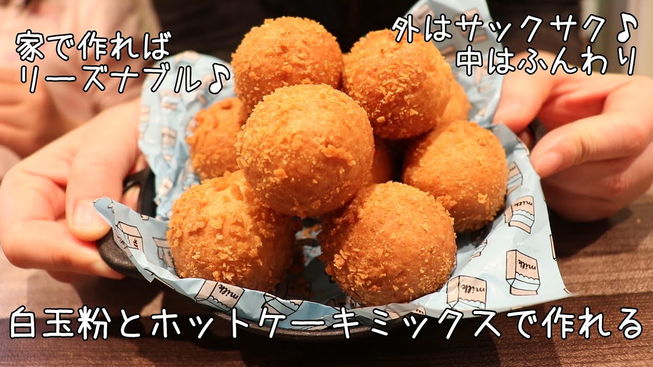 韓国おやつ チーズボール, 材料 10個分 , 白玉粉 75g, 牛乳 100ml, ホットケーキミックス 75g, 溶かしバター 20g,はちみつ 大さじ2, 塩少々, さけるチーズ2本, サラダ油 揚げるよう適量,レシピおうちカフェ簡単レシピレシピ動画チーズボール。