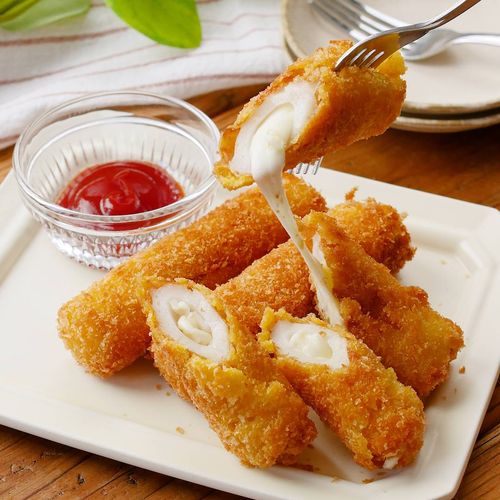 韓国風チーズボール,材料 2名分 , 白玉粉 80g, ホットケーキミックス 50g, 牛乳 90ml, 砂糖 大さじ1,サラダ油 大さじ1 2, さけるチーズ 2本, パン粉 適量, 揚げ油 適量, ケチャップ 適量,手順 ,1.さけるチーズを1本あたり5等分ずつに切る。,2.ボウルに白玉粉、牛乳、砂糖、サラダ油を入れ、よく混ぜる。さらにホットケーキミックスを加えて混ぜ合わせ、手で。