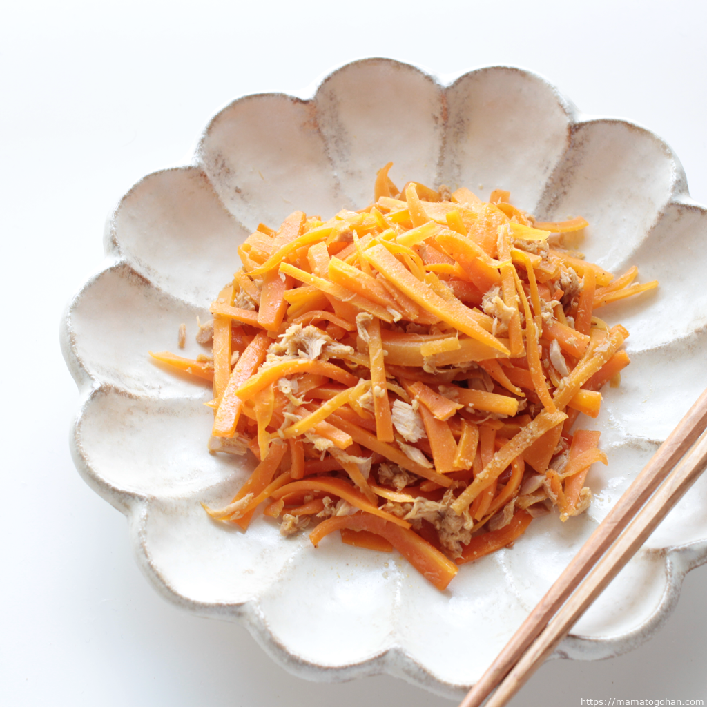 離乳食・幼児食 卵なし!胡麻香るにんじんしりしりレシピままとごはん。