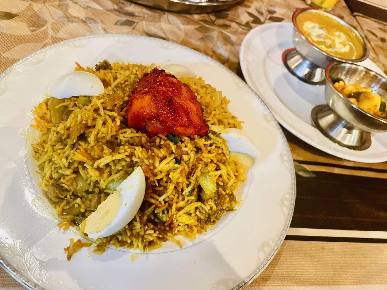 本格ビリヤニセット🍛 バスマティライスで作る、本格ビリヤニ たっぷりのサラダ🥗 カレースープ🍅 パパド ヨーグルト ビリヤニに混ぜて食べてみてください😊ビリヤニセットでどーぞ❣️ラサマンダ岐阜市インドカレーアジアン料理ベトナム料理パクチー水。