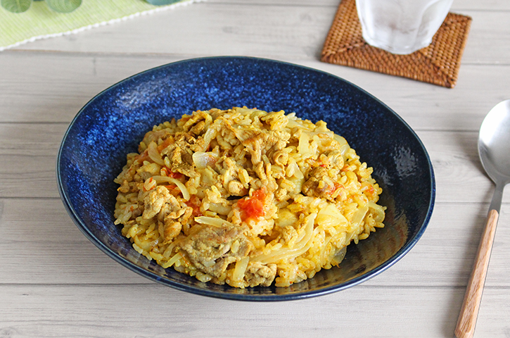 炊飯器ビリヤニ , 敗北をもぎとって、フライドオニオンにした方がおいしいです。, 覚書 材料4人分 , ・バスマティライス 2合 浸水する 300g, ・鶏もも肉400g, ・水300ml, ・ヨーグルト50g, ・トマト 1 2個, ・フライドオニオン20g,自作する場合は、玉ねぎ1個200g分を使う , ・にんにく、しょうが1かけ すりおろし , ・ピーマン1 2個,。