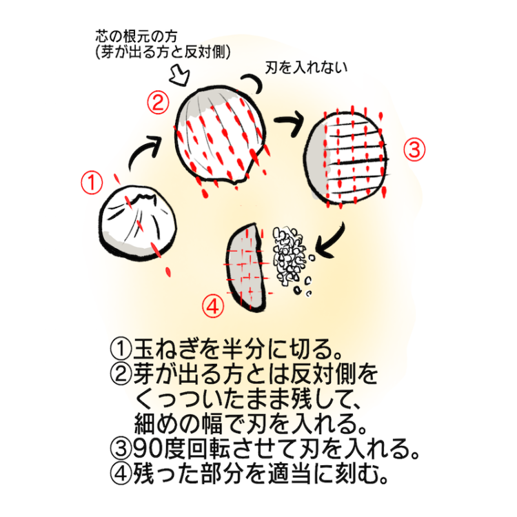 玉ねぎの辛さを調節できる切り方イラストHayasi Tarou Illustration。