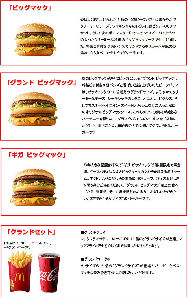 「ビッグマック」の1.3倍の重量!特製ビーフとバンズで満足度グランド級! 「グランド ビッグマック」日本マクドナルド史上初・ギガ級バーガー 「ギガビッグマック」 数量限定4月6。