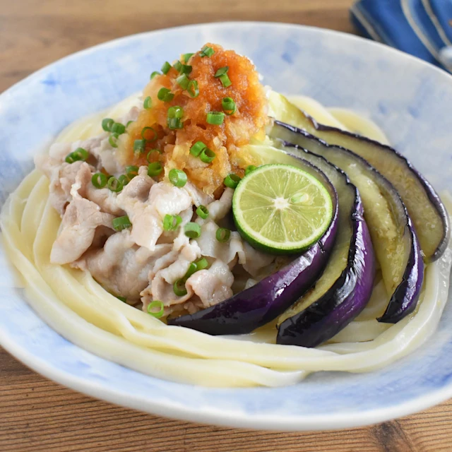 レンジで簡単!豚しゃぶとなすのだしぶっかけうどん。