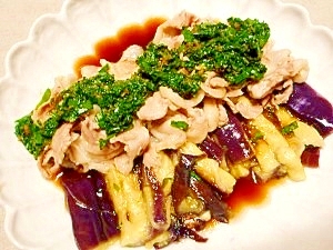 レンジで簡単!ウマい♪『豚しゃぶ肉とナスのしょうがポン酢」。