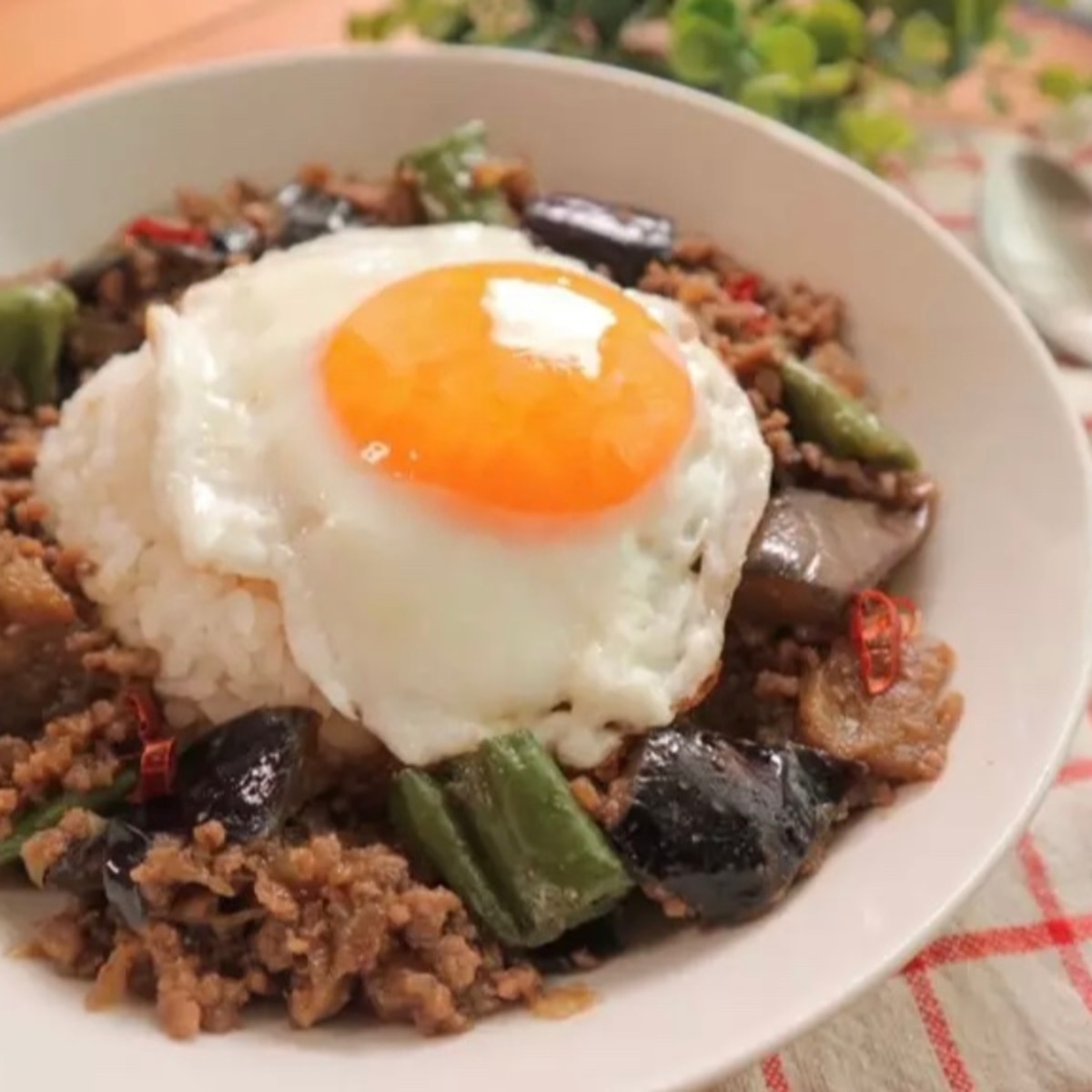 簡単カフェごはん 茄子とひき肉のオイスターそぼろ乗っけ丼*温玉乗せ。