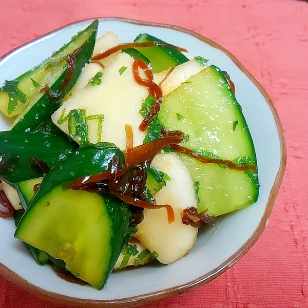 やみつきになる! たたききゅうりと大葉の塩昆布あえ。