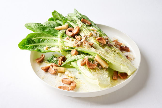 アル・ケッチァーノ 奥田政行氏考案 フィッシュソーセージをかけたシーザーサラダ。