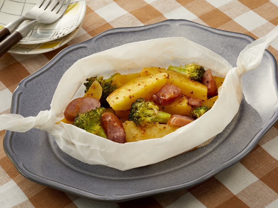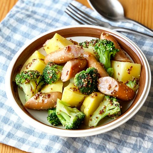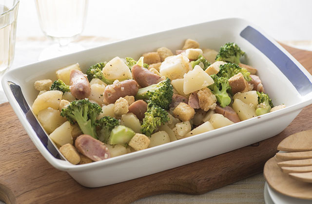 ブロッコリーとじゃがいもとソーセージのホットサラダ。