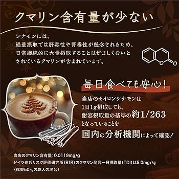 セイロンシナモンとカシアシナモン 「シナモンは身体に良いけれど、取り過ぎは健康に良くないのですか?」 という質問をいただくことがあります。東京都福祉保健局のサイトによると、シナモンの香りの成分の一つであるクマリンという物質を過剰に接種することにより、肝。