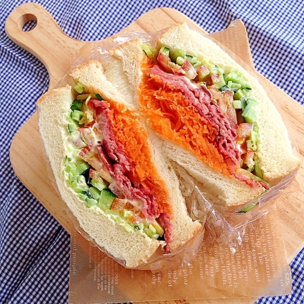 簡単☆野菜たっぷりローストビーフのサンドイッチ♪。