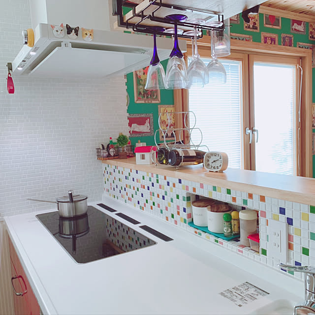 シンクと調理台前の立ち上がり部分、白い壁には名古屋モザイクのタイルを採用。奥さまのテンションが上がるおしゃれなキッチンが誕生! くふうイエタ。