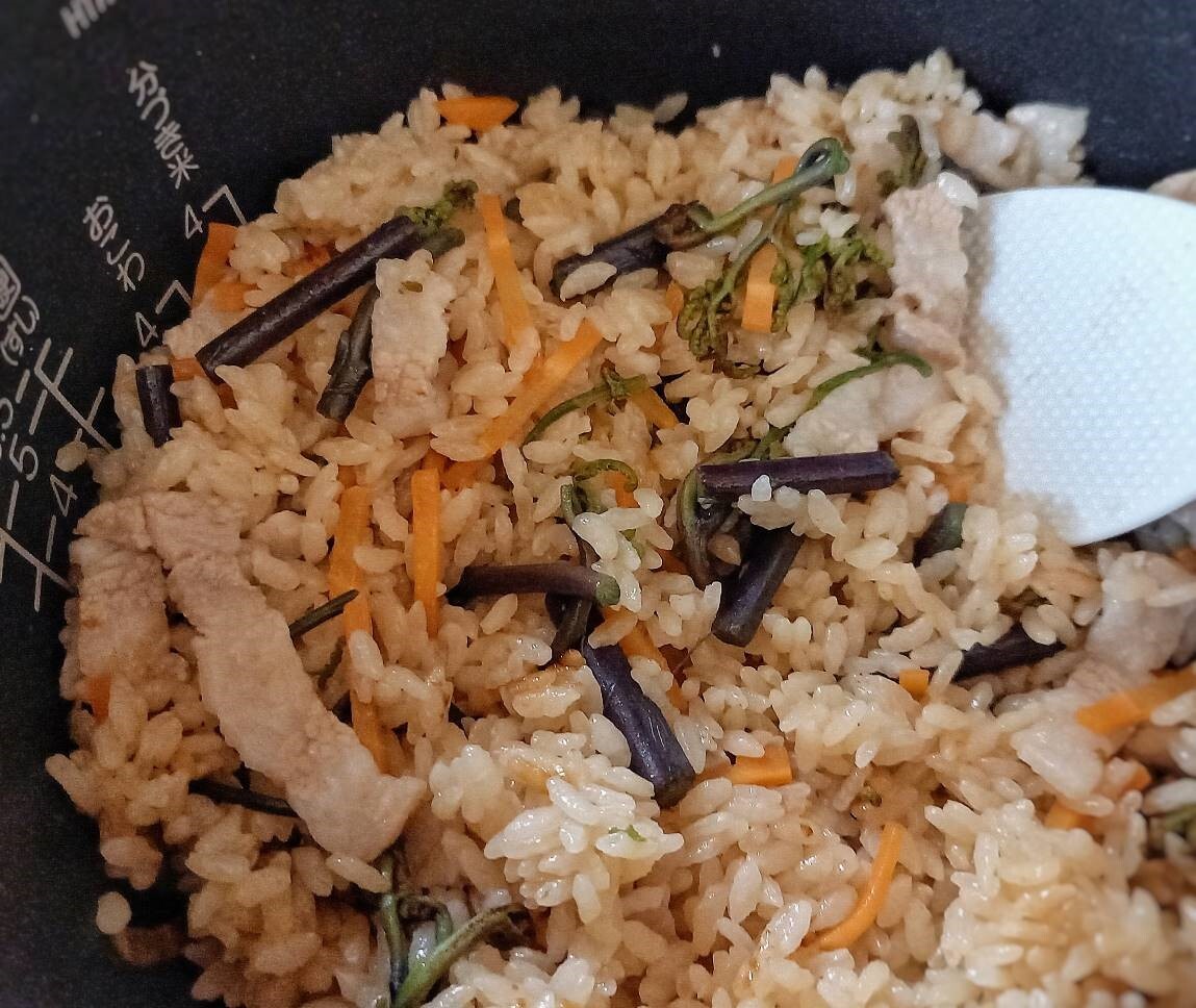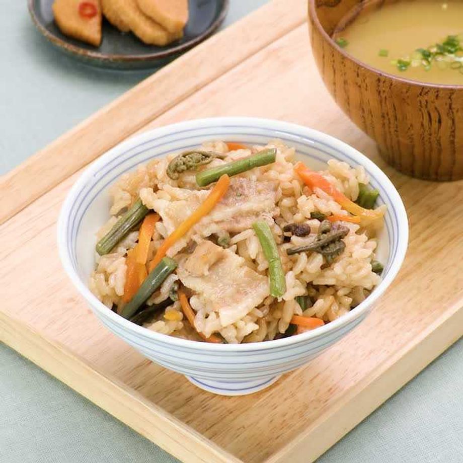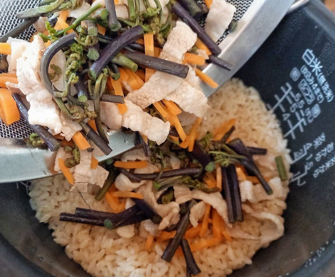 わらびと豚バラ肉の炊き込みごはんのレシピ。簡単ひと手間で絶品。
