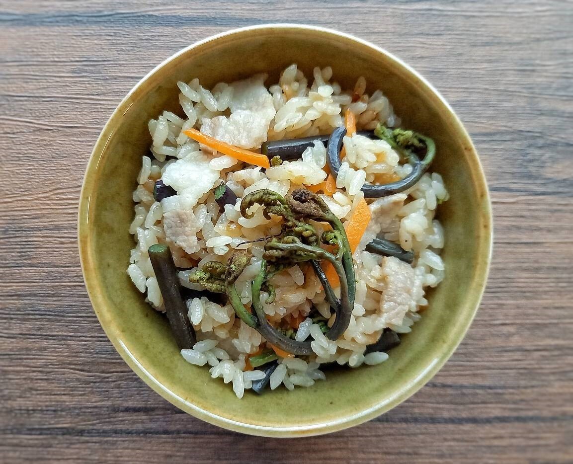 定番の わらびと豚の炊き込みご飯mieuxkanon*。