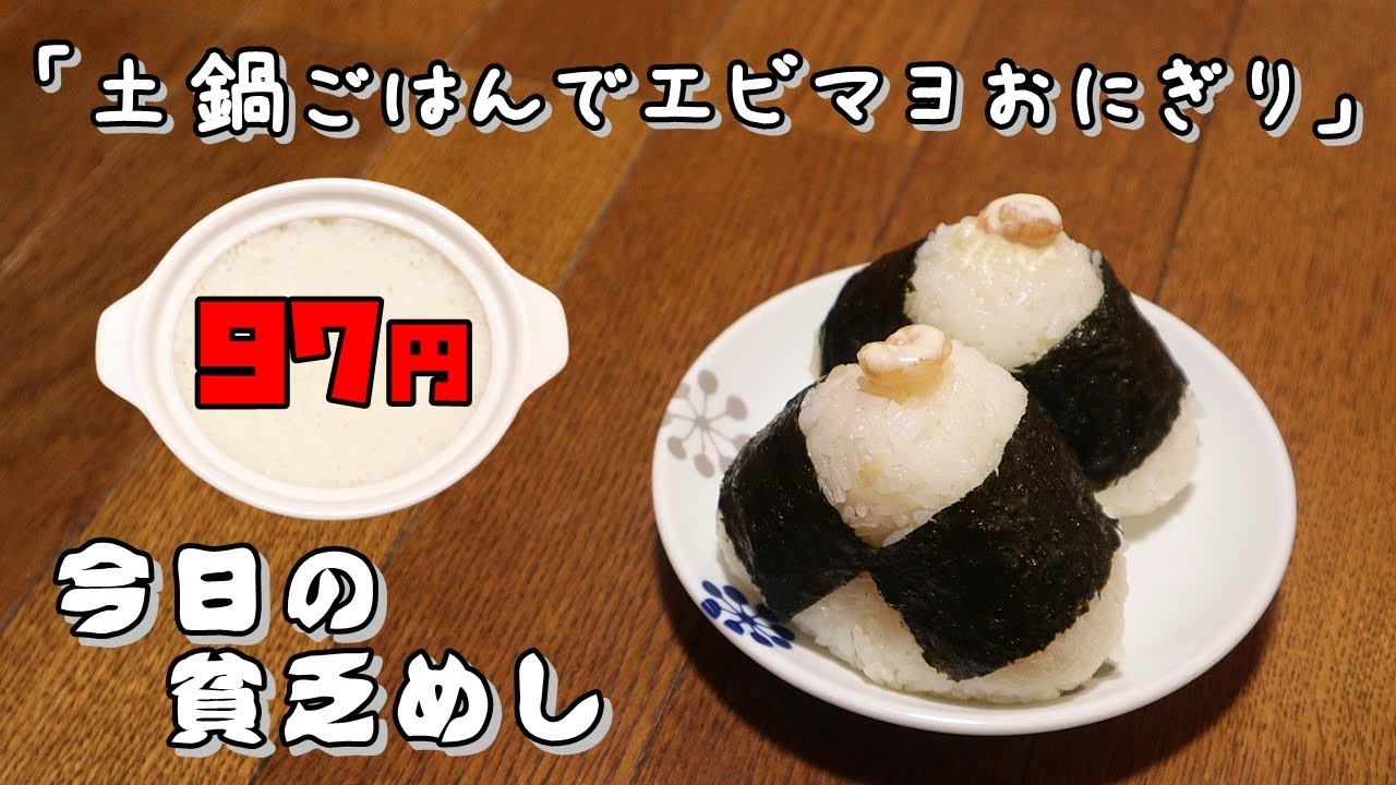 今日の貧乏めし土鍋ごはんでエビマヨおにぎり97円 貧乏飯、貧乏料理レシピ。