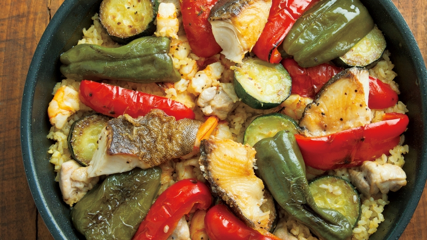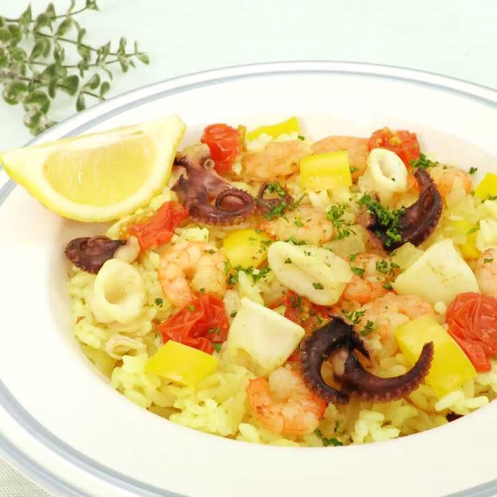 シーフードとトマトのパエリア風レシピマリンフーズ。