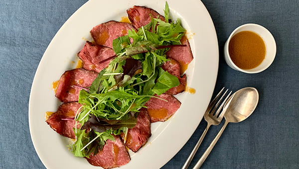 一皿を華やかに!ローストビーフをバラの花の形に巻く盛り付け方。