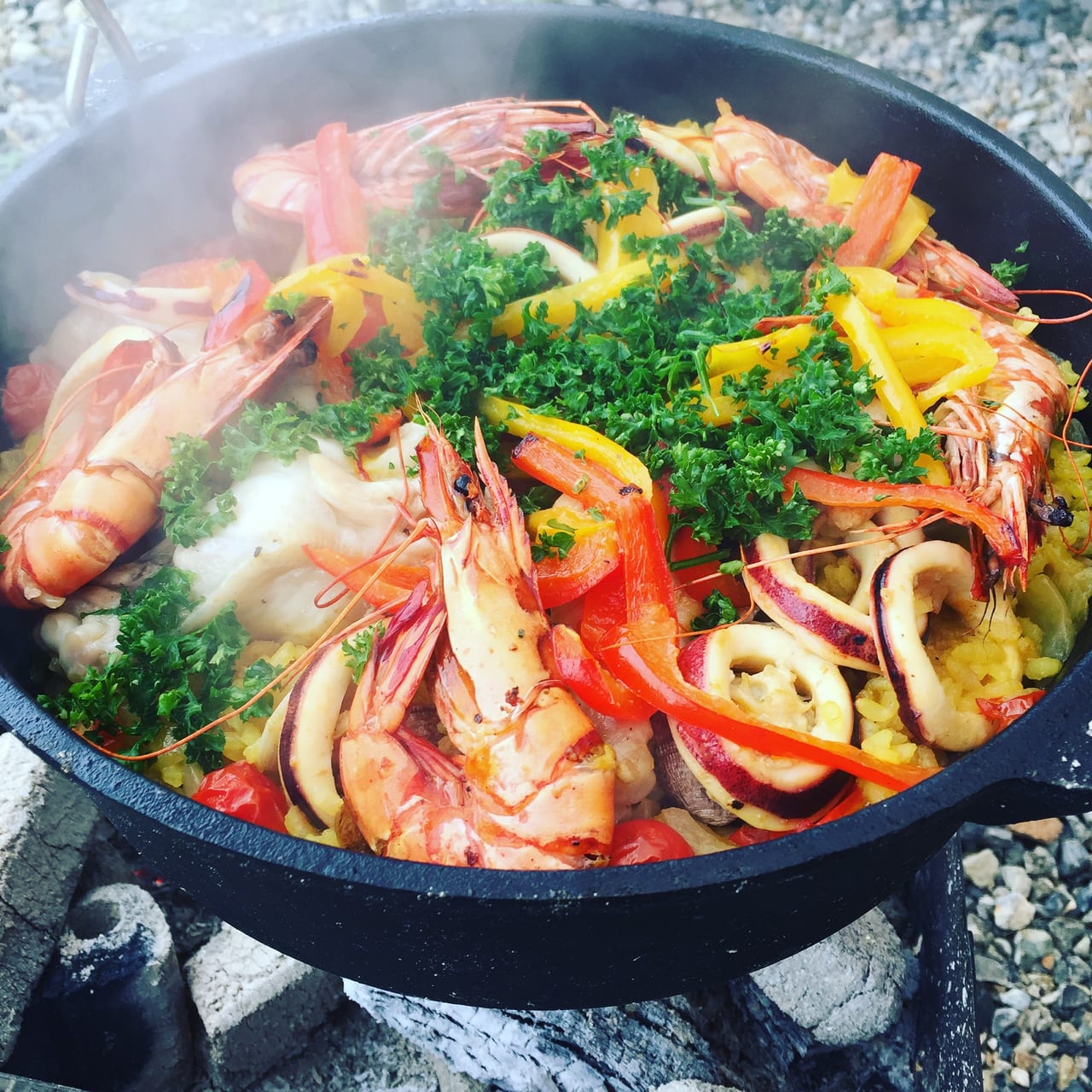 ダッチオーブンでパエリア 焚き火で鉄鍋料理。おこげが格別。魚介の旨みたっぷりのパエリア。