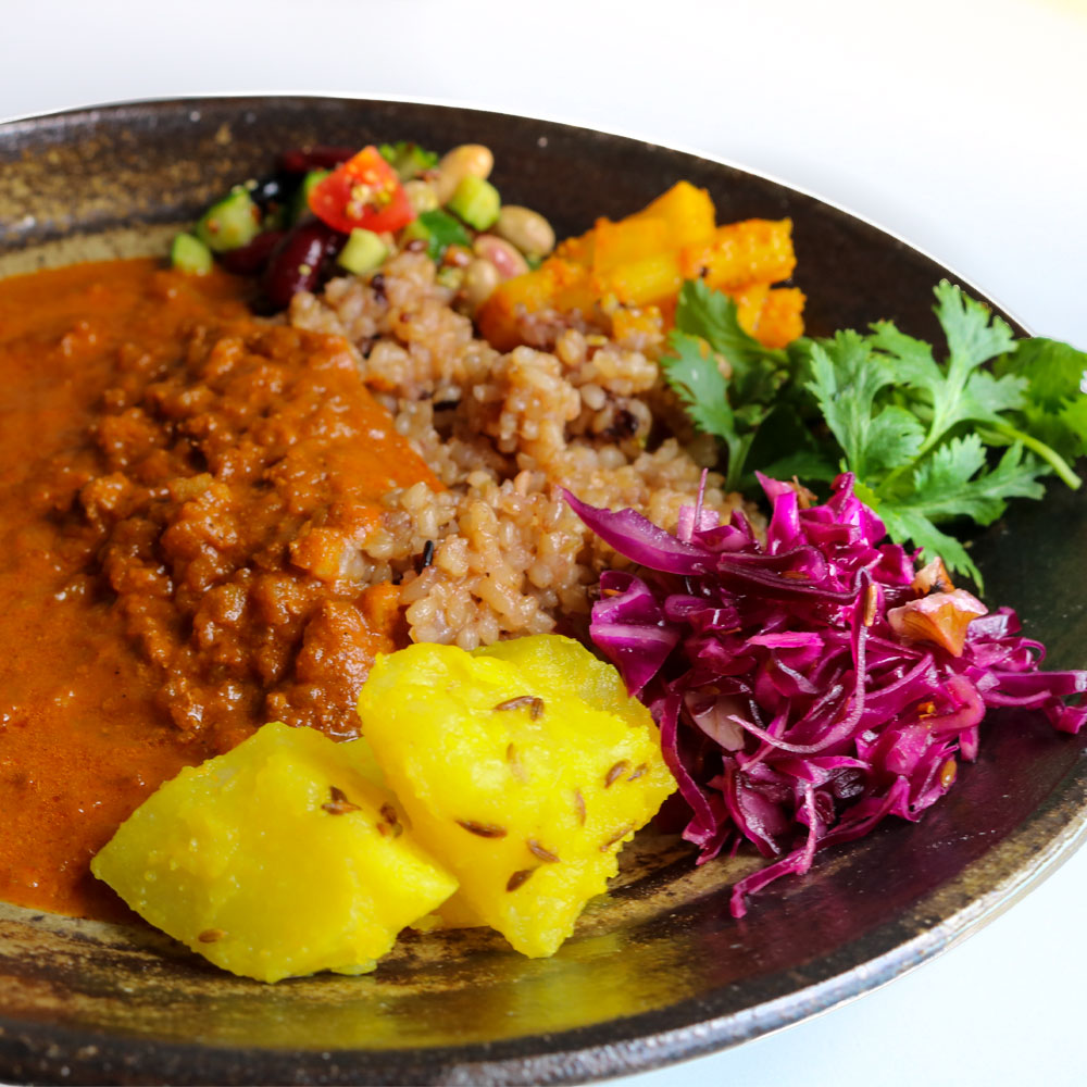 レンズ豆と野菜のスパイスカレー 付け合わせは紫キャベツのアチャール . 材料はほぼ全て野菜か豆 . カレーなどに 使われるスパイスのクミンは、消化促進だけでなく 美容にも良いので、 朝、昼、晩 関係なくオススメ✨ あと、カレーだからといって 白米やナンだけで。