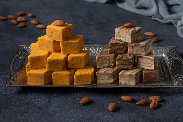 濃い灰色の背景にアーモンドとココアを添えたオリエンタルミルクハルヴァのおいしいスライス。ウズベキスタンの伝統的な手作りのお菓子。の写真素材・画像素材Image 175512499。