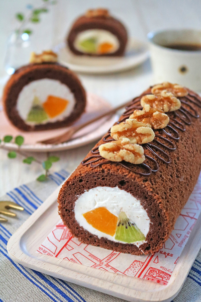 フライパンで手軽にできるふわふわチョコチーズロールケーキ。
