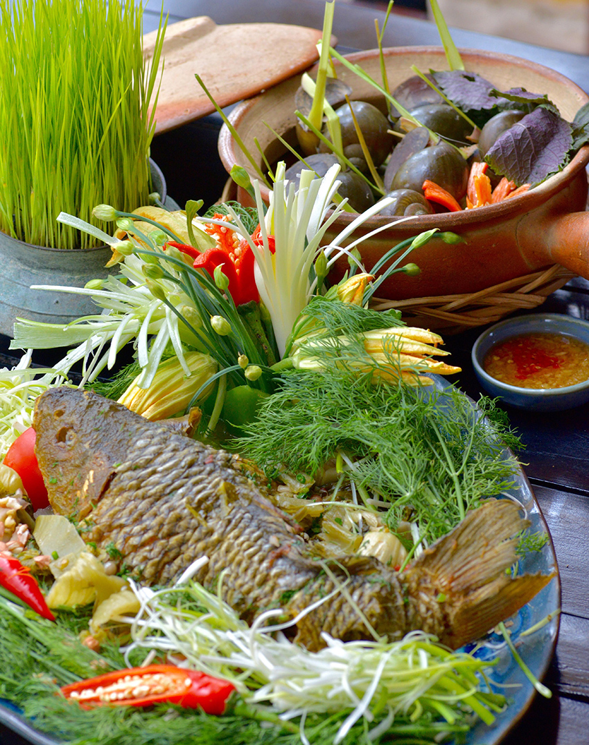ホーチミン市・お国の逸品 鯉を丸ごと一匹、蒸し煮に!高菜&山盛りディルと味わう北部名物 - Son Ha Garden。