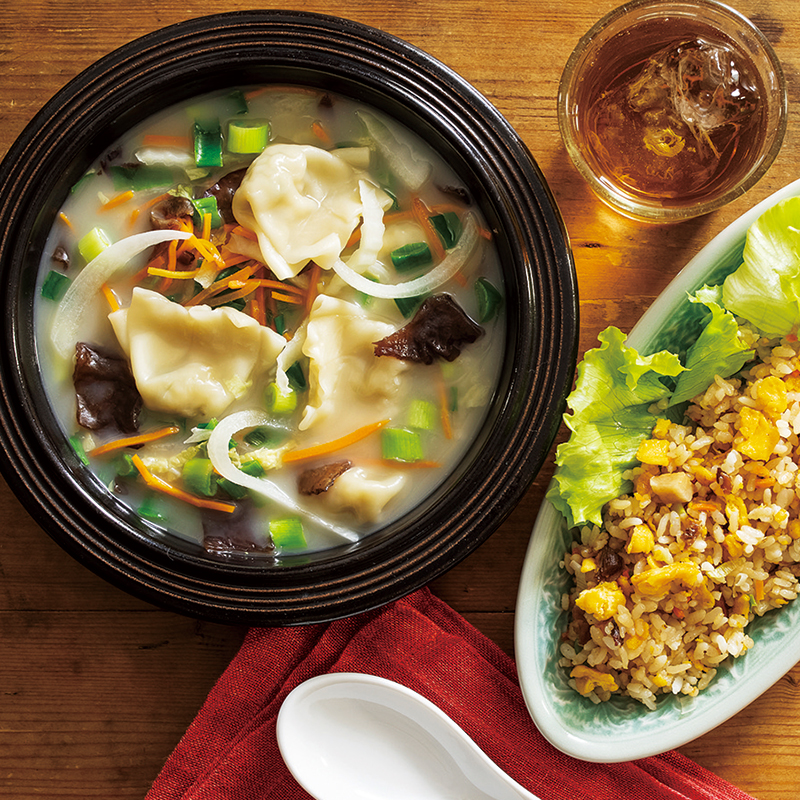 「白湯水餃子スープ」、チャーハン ちぎりレタス添え 2人分。