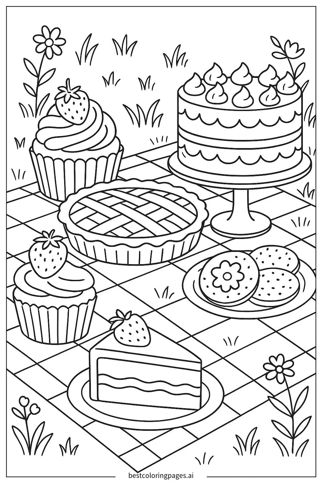 さまざまなデザートとピクニック ぬりえ - 無料印刷可能BestColoringPages AI。