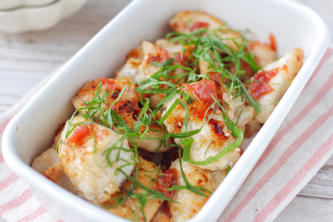 鶏むね肉のうま味を梅ソースが引き立てる「鶏しそチーズ焼き」のレシピ毎日が発見ネット。