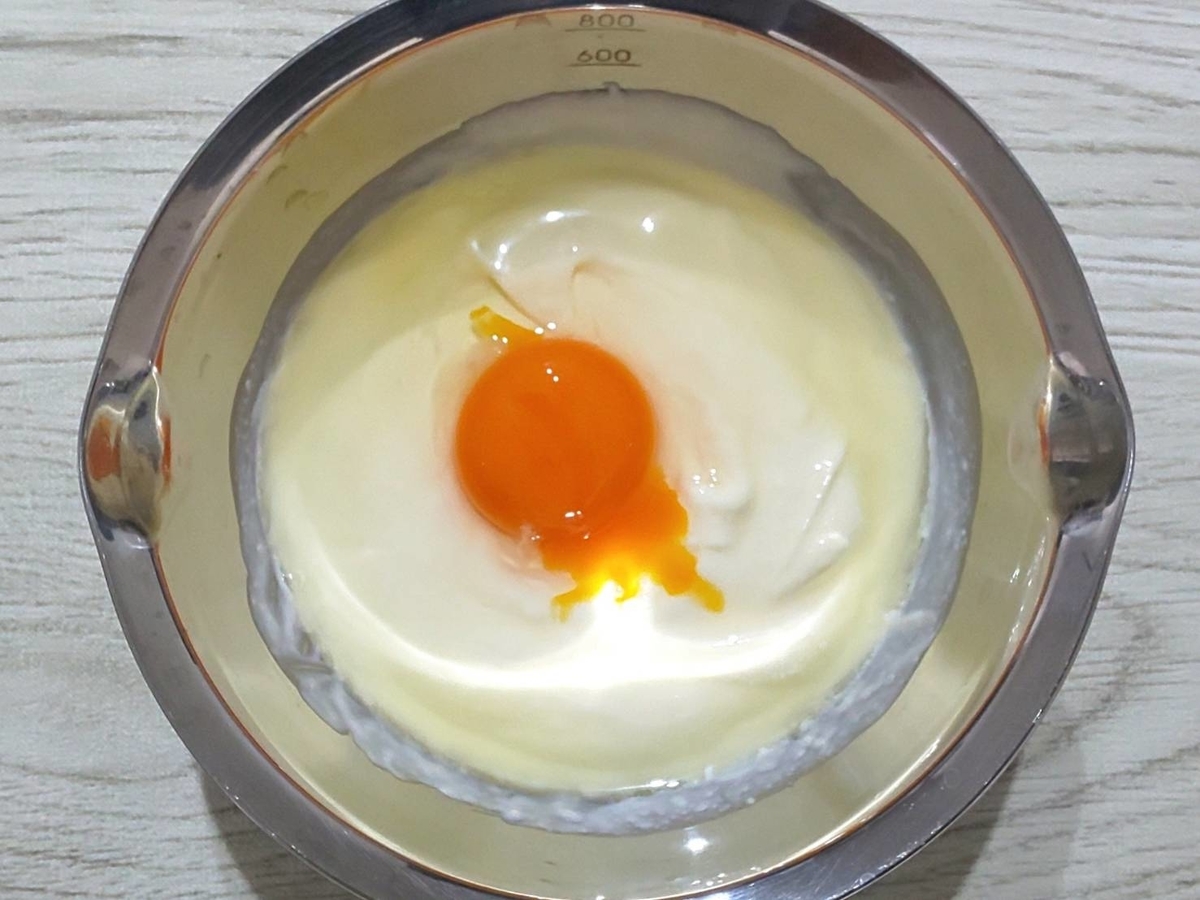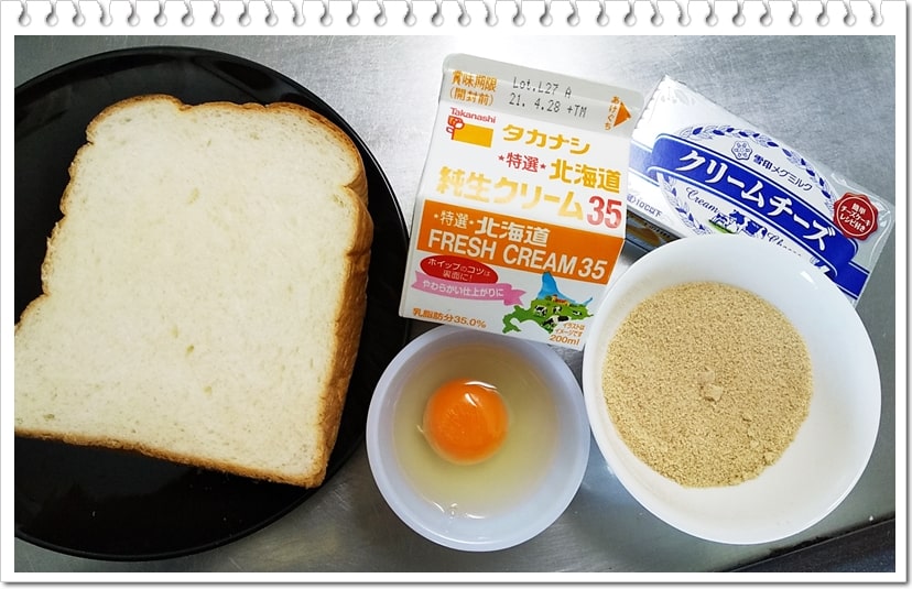 バスクチーズケーキトースト』 ①ボウルにクリームチーズ100g、砂糖40gを入れよく混ぜる ②生クリーム100mlを3回に分けて入れ混ぜる。③卵1個を入れ、さらに混ぜる ④4枚切り食パン全体の表面をスプーンで凹ませる ⑤クリームを流し入れ、トースターで7分焼けば完成。