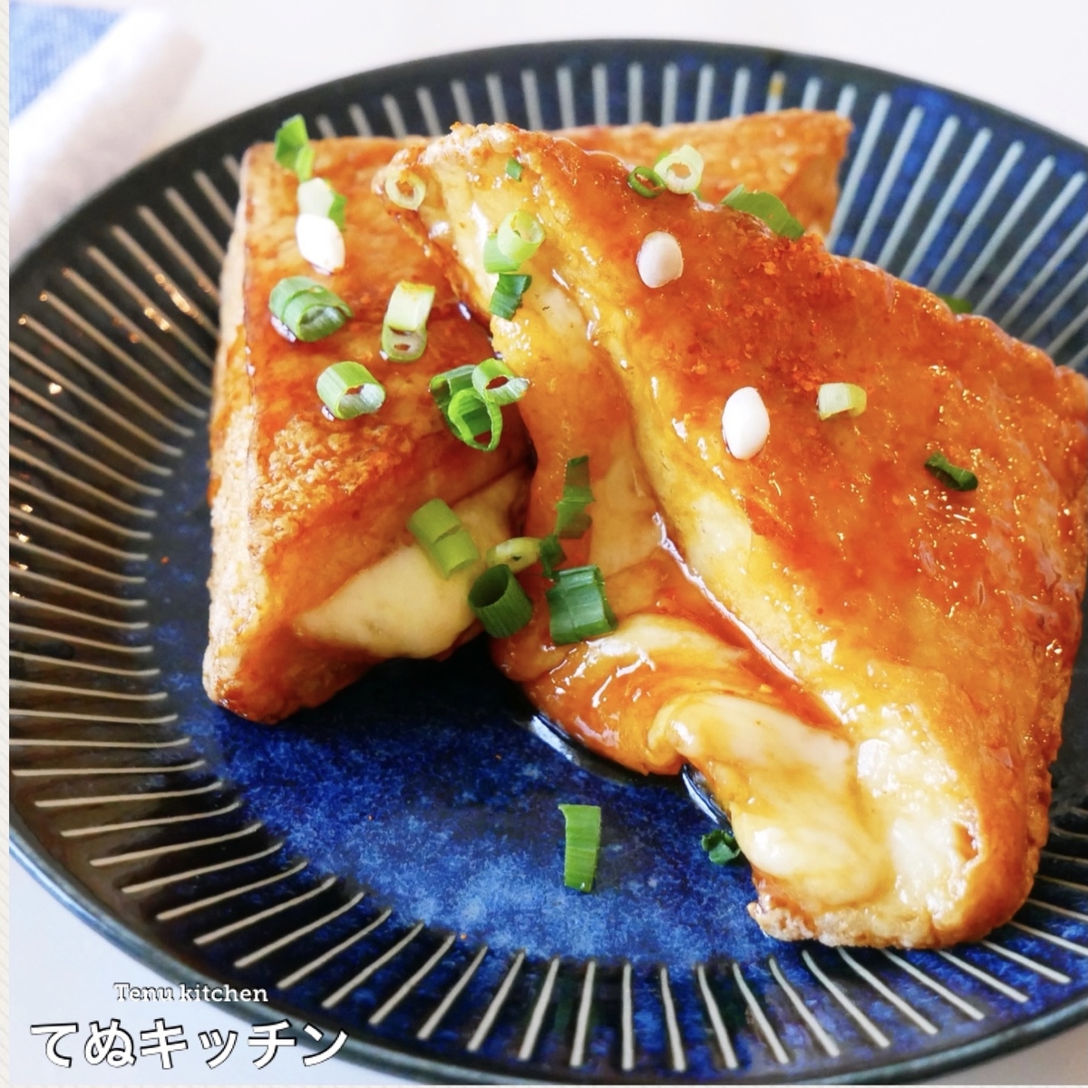 「金のつぶたれだけたっぷり!たまご醤油たれ」がたまらない!厚揚げチーズサンド。