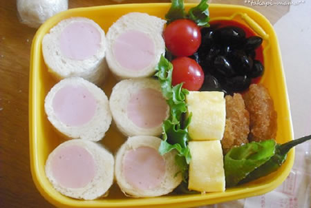ロールサンド ラップを使ってくるくる〜っと巻くだけ「ロールサンドイッチ弁当」。
