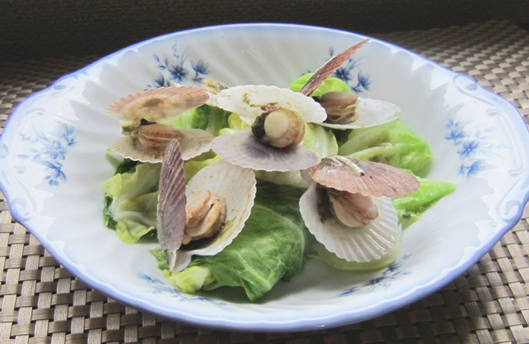 ほたて稚貝とキャベツの蒸し煮 4人分青森県ほたて流通振興協会。