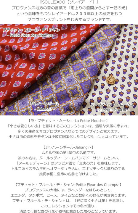 楽天市場 『SOULEIADO≪ソレイアード≫』La Petite Mouche & Jahangir & Petite Fleur desChampsコットン100%シーチングプリント素材:コットン100%生地幅:約110cm商用利用不可 プロバンス ウェアー 服 小物 手作り ハンドメイド: 手芸と生地の。