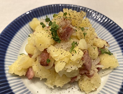 プロに学ぶレシピ『マヨネーズなし!濃厚ベーコンポテトサラダ』コウケンテツさんレシピ参考。いそがばまわれ。