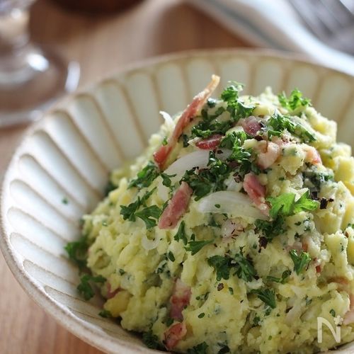 パセリたっぷり!新玉ねぎとベーコンのポテトサラダ。