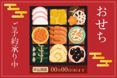 飲料・食品、お正月、シンプル、スタイリッシュ・おしゃれ、高級感・きれいめ、ナチュラル・爽やか、シズル感のバナーご予約承り中の「おせち」BANNER LIBRARY。